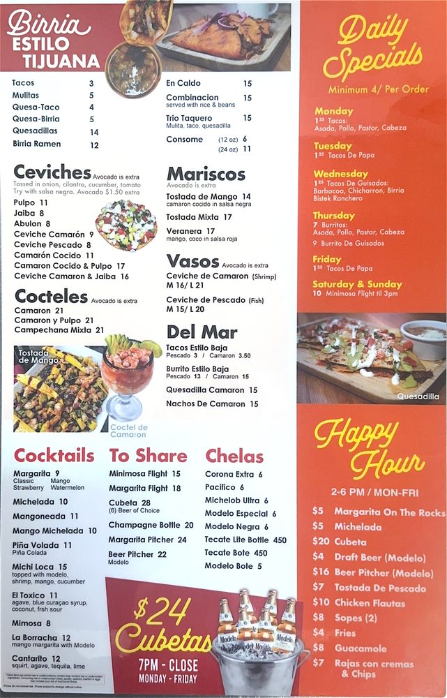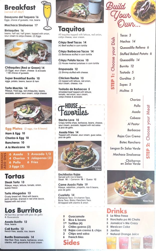 Start your day with delicious breakfast plates such as the Desayuno Del Taquero or the hearty Super Breakfast Burrito. For egg lovers, standout choices include Chorizo & Egg and Rancheros, each priced at a budget-friendly $10.00.